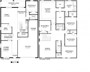 Providence Sequoia Floor PlanThe Sequoia at Grantham Springs offers 6 bedrooms, 3 baths and 3,889 sq. ft. of living area.  The Sequoia residence also comes with a 3 car tandem garage, front covered porch, rear covered patio, a downstairs den for your office, an upstairs laundry, bonus room and master suite that features twoclosets.