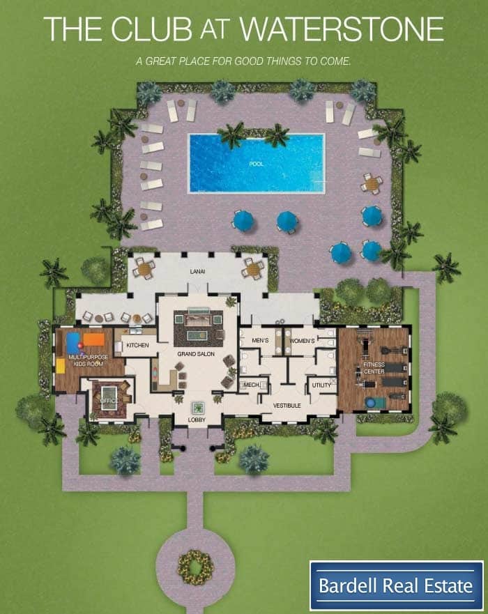 The site map for Waterstone Villas is simply laid out. There are a total of 96 luxury courtyard villas including ample parking for the vacation villa. Each homesite has native and natural landscaping with wide, unobstructed views. The main road is brightly lite with decorative street lights. You will notice there are no poles and no visible wires as all utilities are underground making a clean look for this community. Along with lush landscaping and a clean feel, Waterstone Courtyard Villas offers a community clubhouse, called The Club, which features many amenities such as: